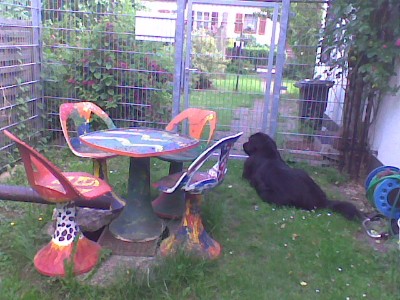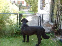 Keine Ahnung warum, aber plötzlich ist da ein Zaun, der 1,8o Meter hoch ist. Er trennt den hinteren Teil des Gartens vom vorderen ab. Da komm ich nicht rüber! Und ich komm auch nicht mehr bis zur Straße vor. Ein paar Mal war ich jetzt schon allein in „meinem Teil“ des Gartens. Ich bin nicht gern allein. Aber ich hatte Zeit, mich genau umzusehen. Ich weiß, jeder glaubt nun, ich würde anfangen zu graben. Aber das ist doch eine zu plumpe Lösung und nur für einen Hund der Muskeln hat aber nichts im Kopf. Kurz: Nichts für mich!