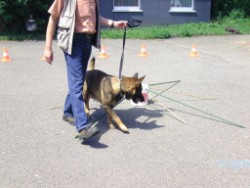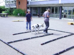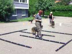 Dann hat Biggi "Hund gespielt". Corinna hat sie an die Leine genommen. Biggi musste die Augen zu machen und wurde mit geschlossenen Augen durch den Parcour geführt. Da merkt Biggi mal, wie wenig man an der Leine ziehen muss, um etwas mitzuteilen! Und das haben wir dann gemeinsam im Parcour geübt.