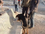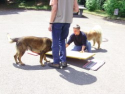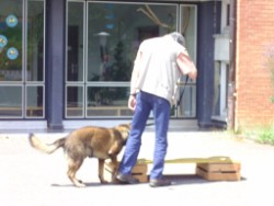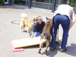 Corinna hat auf dem Schulhof einen Parcour aufgebaut. Da konnte ich zum ersten Mal in meinem Leben über eine Wippe laufen. Biggi sagt, das brauche ich. Beim Zughundewettbewerb muss ich das mit Wagen können! Kleinigkeit - beim Üben hier hatte ich gar keine Probleme.
