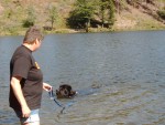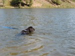 Dann sind wir an die Wiese gefahren. Das ist ein kleiner Fluss. Stellt euch vor, da ist so viel Wasser drin, dass ich plötzlich keinen Boden mehr unter den Pfoten hatte. Das war vielleicht komisch. In der Provence gibt's das nicht! Ich bin dann vorsichtig zurück ans Ufer. Puh - war das aufregend. Inzwischen war ich schon oft im Wasser und ich weiß jetzt auch, dass ich ein guter Schwimmer bin.