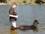 Da ich ein Molosser bin (so nennt man so große Rassen) und ich mit meinen 70kg eine echte Herausforderung bin, ist Biggi mit mir in die Schule gegangen. Sie hat eine Hundeschule gesucht, in der nicht rumgebrüllt wird und man ohne Gewalt auskommt. So sind wir bei Petra Thoma gelandet. Sie hat Biggi ein paar ganz tolle Tipps gegeben. Aber sie hat auch gleich gesehen, dass ich Probleme mit dem Rücken habe. Wiederholtes Sitz und Platz war gleich mal gestrichen, auch das Ein- und Aussteigen beim Auto. Ich hatte sowieso keine Muskeln.